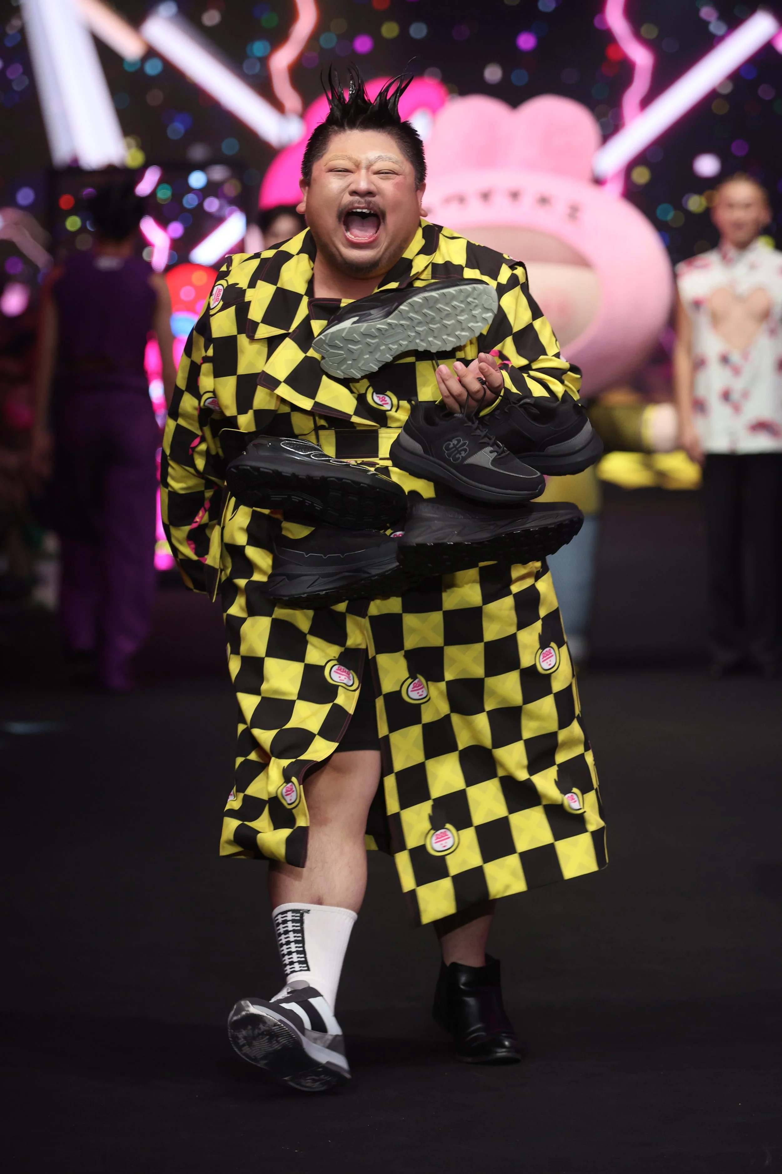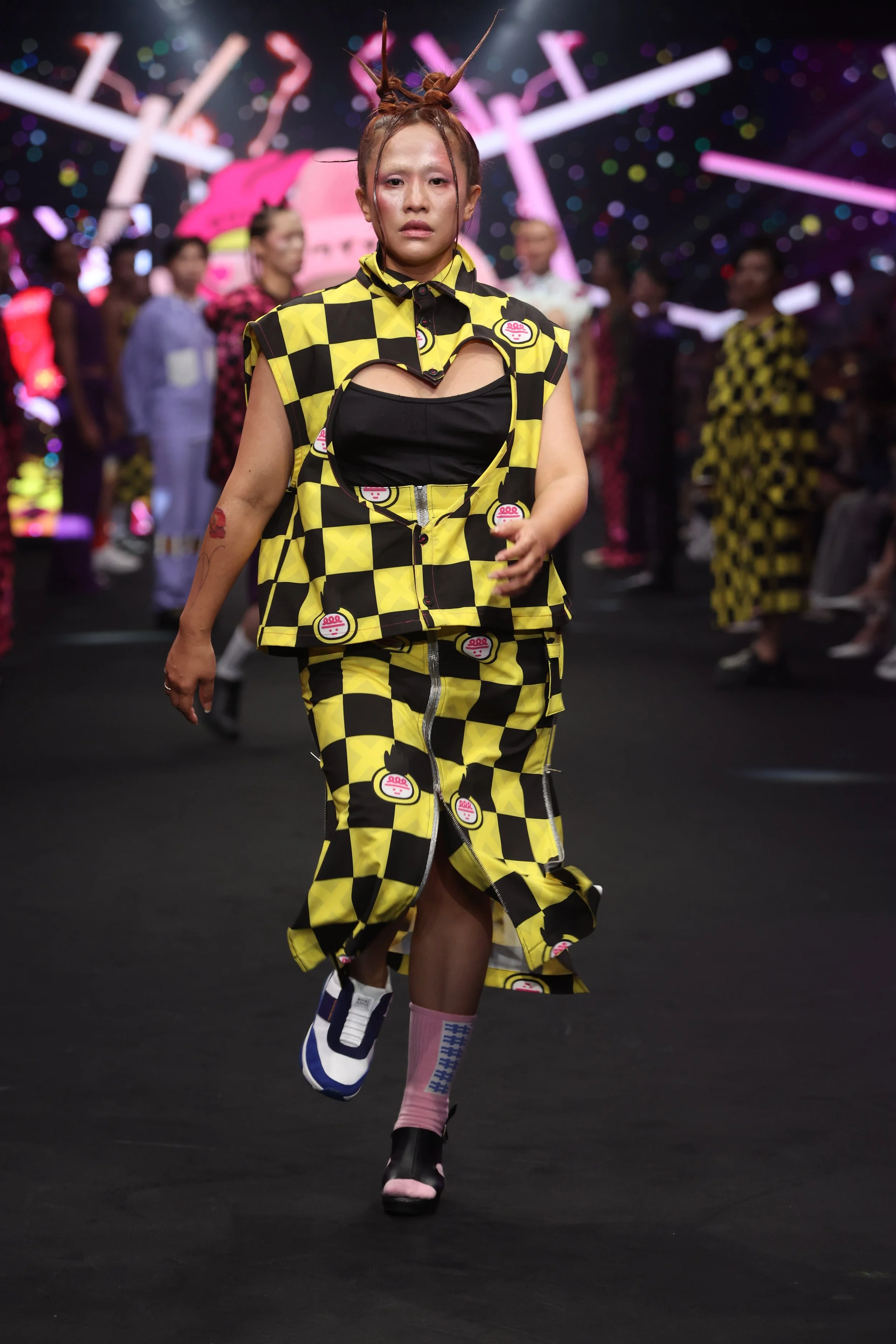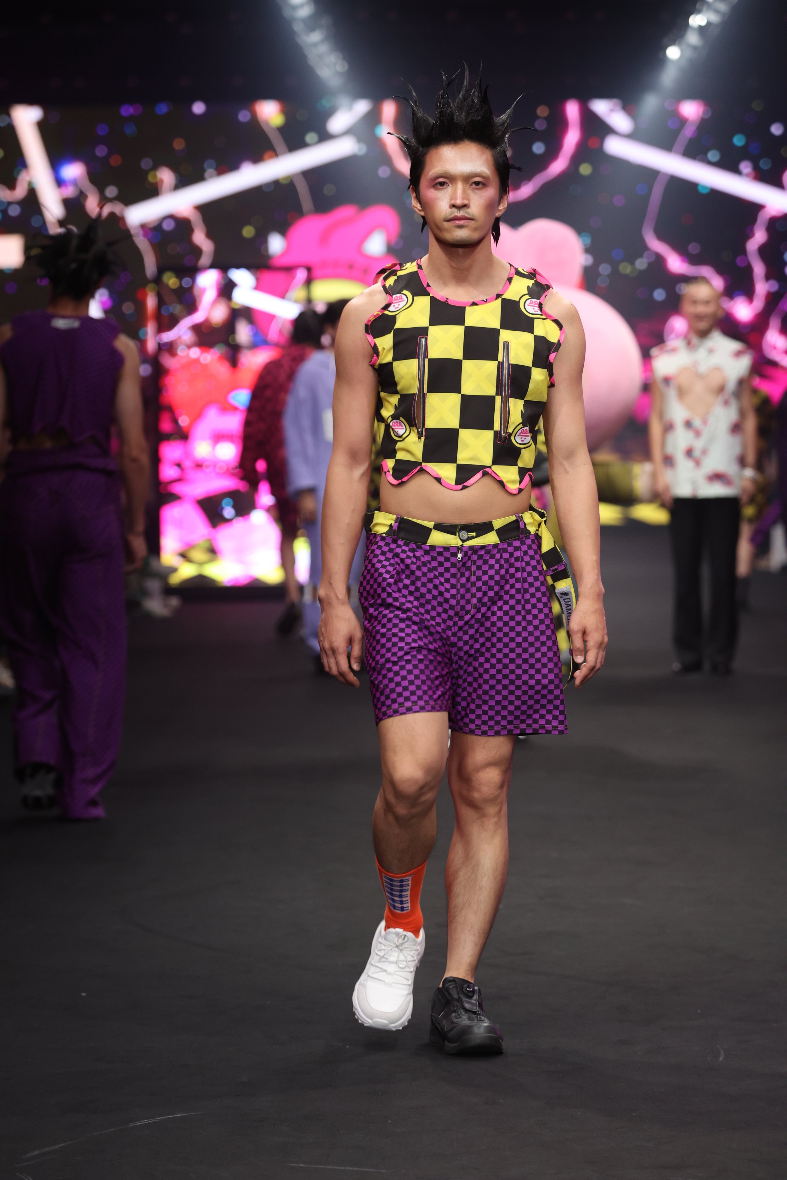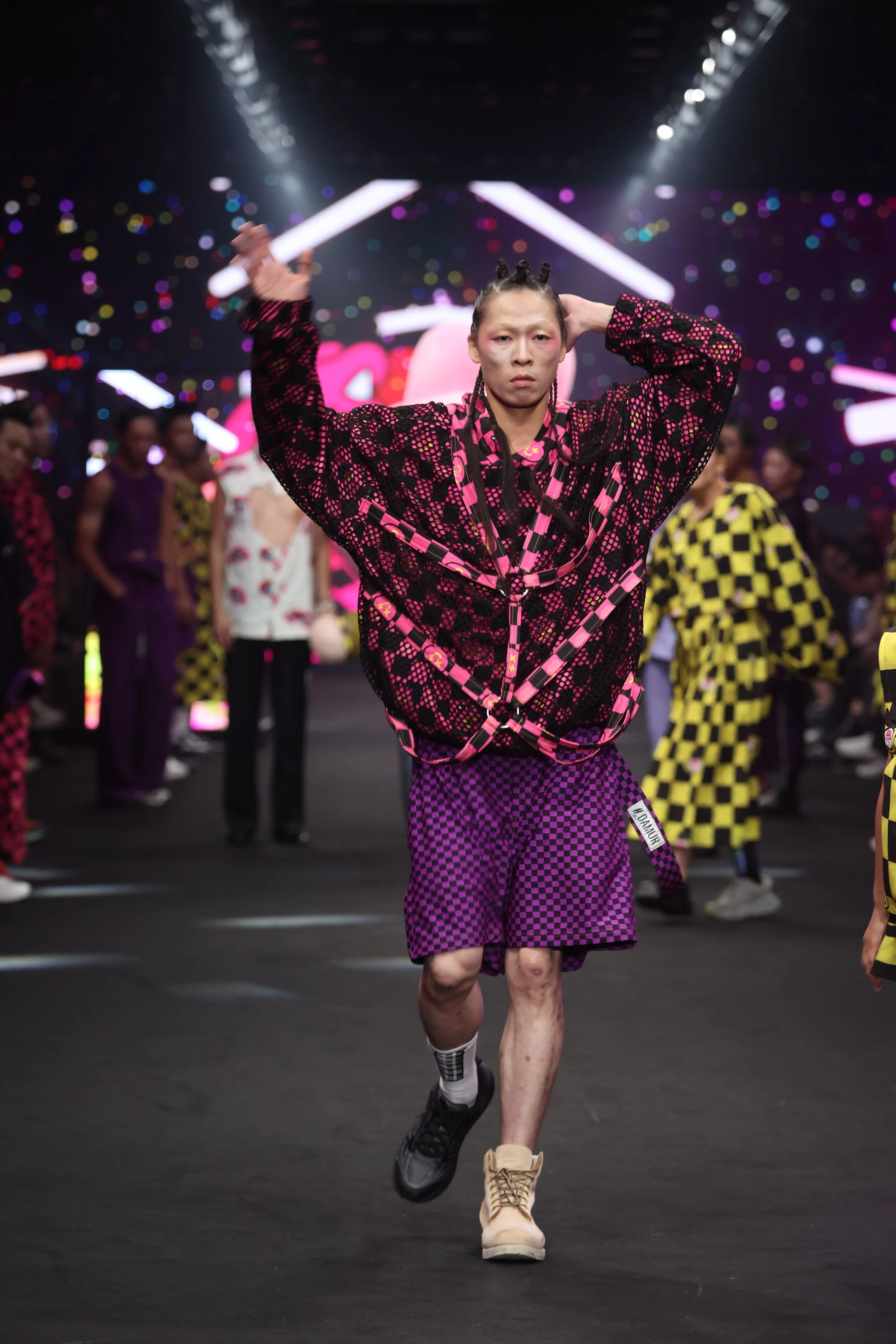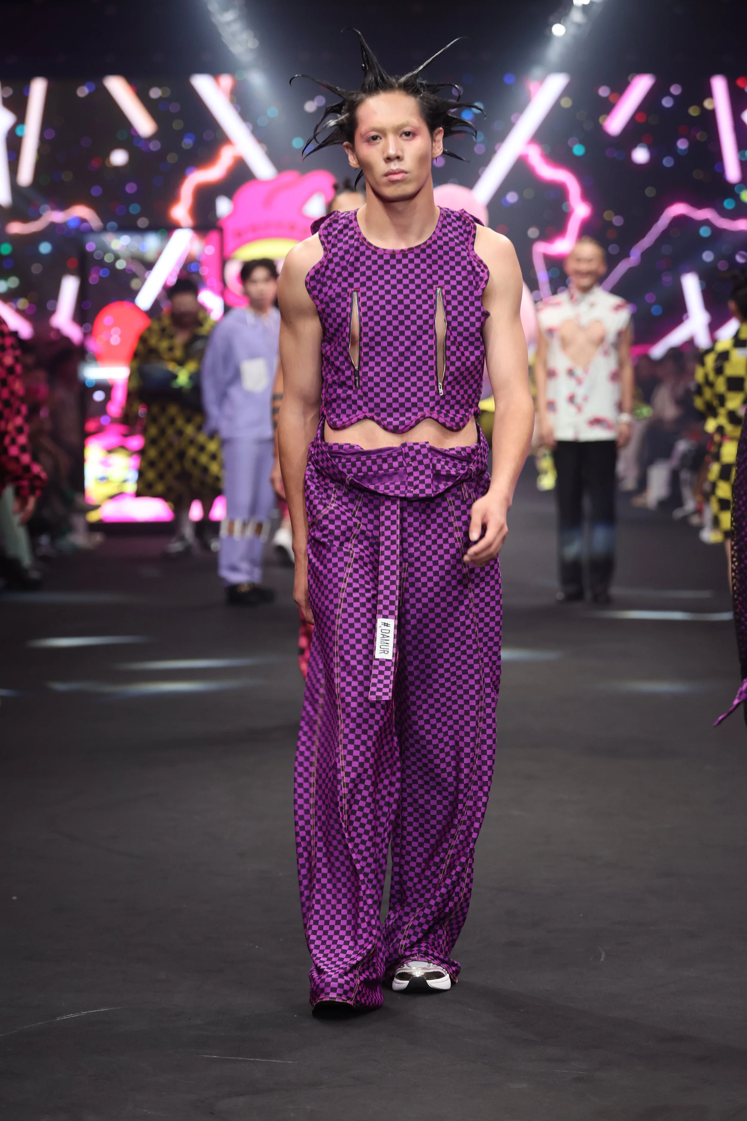 The creative concept behind this series fuses two distinct artistic styles. It builds on the vivid and playful colors of wei wei boy, incorporating the high-saturation tones and intense energy characteristic of Berlin. The collection also introduces elements of BDSM culture, such as fishnets, straps, and metal zippers, adding kinky details to the mix. These are tied together with #DAMUR’s signature check and wave patterns. This collaboration is not just a collision of styles but a deep conversation between two unique souls, addressing themes of fashion, art, gender, and fantasy.