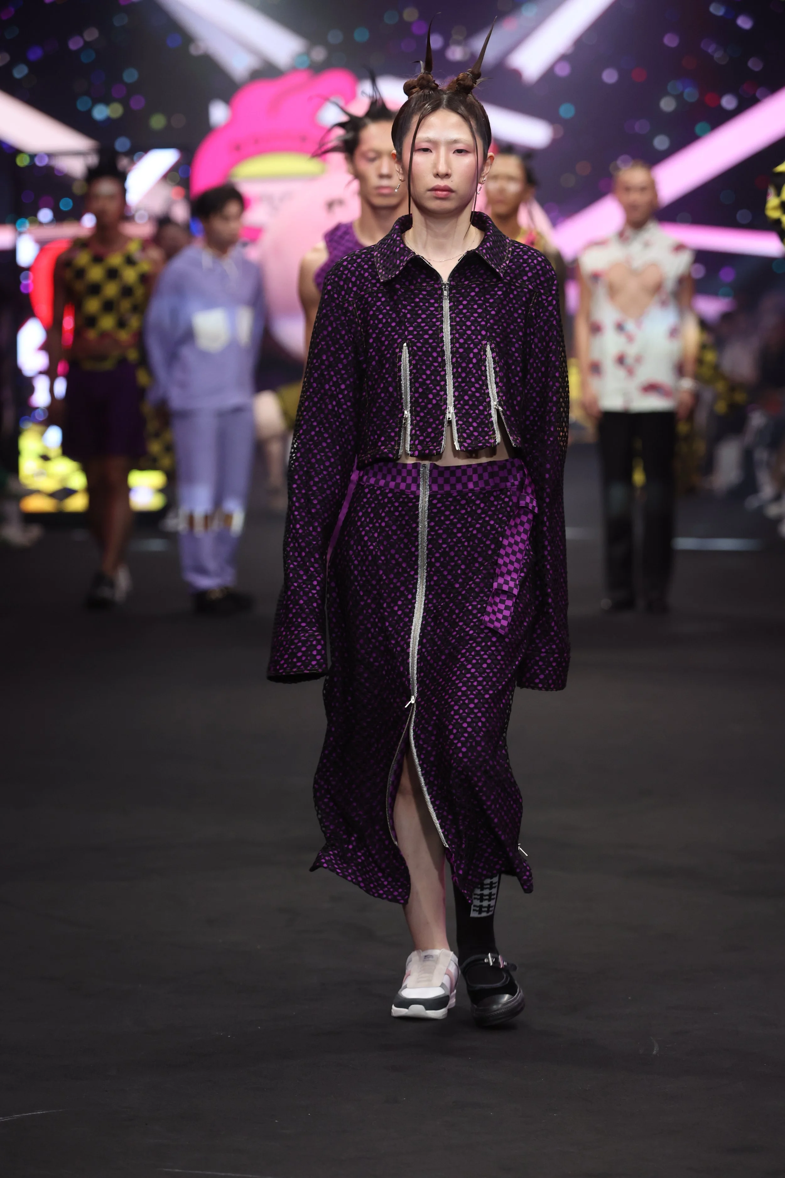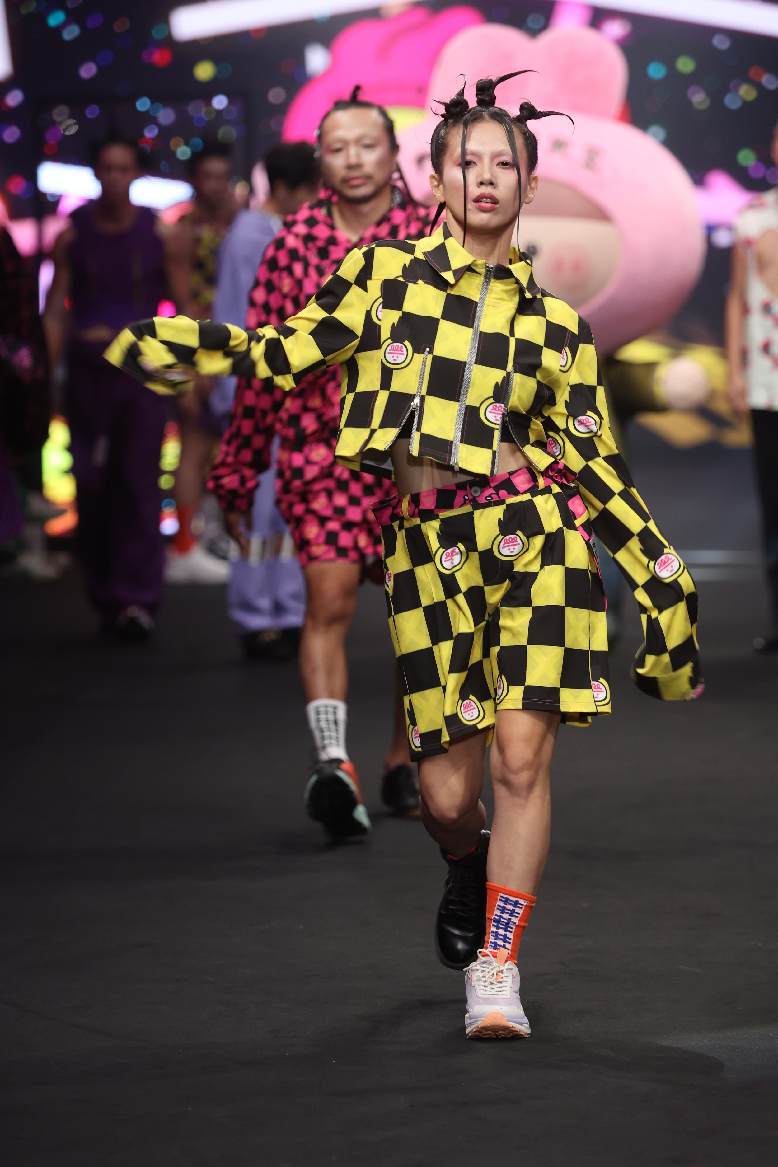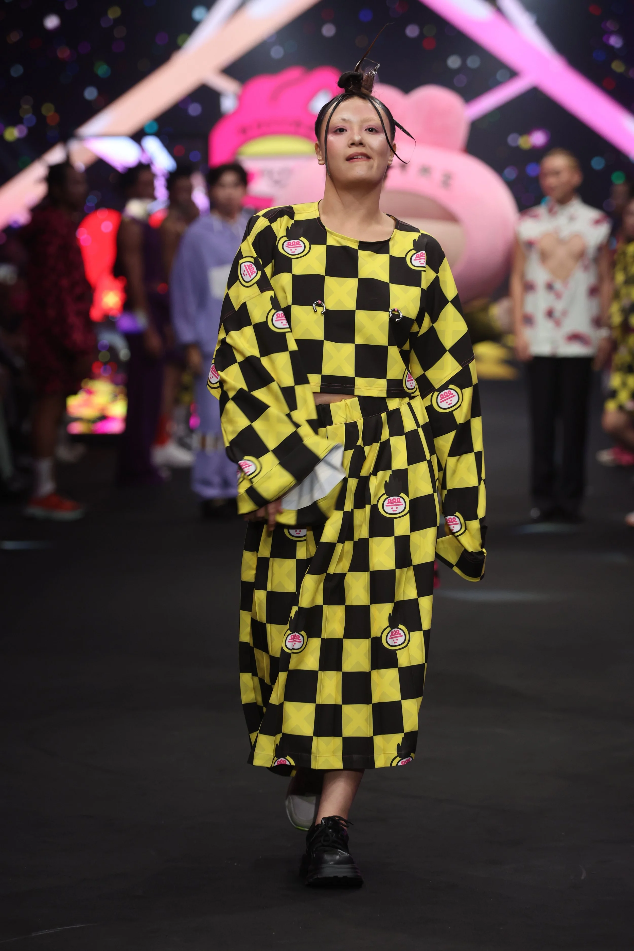 For SS25 Taipei Fashion Week Opening Show, we collaborated with Taiwanese IP Creator wei wei boy and created the "wei wei boy goes to Berlin" Collection. This collection merges #DAMUR’s bold and fearless aesthetic with wei wei boy’s cute style, creating a fashion line that’s both playful and rebellious. The design draws inspiration from wei wei boy’s iconic IP characters, depicting their dream of traveling to the free-spirited city of Berlin. Known for its open-mindedness, subcultures, vibrant nightlife, and multicultural mix, Berlin not only influenced #DAMUR’s designs, but also served as the perfect backdrop for wei wei boy and his friends’ adventurous tale.